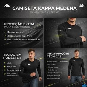 Desenvolvida para quem leva o treino a sério, a Camiseta Kappa Medena Manga Longa é a escolha certa para esportistas que buscam conforto, proteção e liberdade de movimentos durante a prática esportiva. Confeccionada em 100% poliéster, a peça oferece um toque leve e agradável ao corpo, auxiliando no conforto durante exercícios de média e alta intensidade. As mangas longas garantem proteção extra, sendo ideais para treinos em dias mais frios ou ambientes climatizados. Com design clean e esportivo, a camiseta possui visual totalmente preto, gola careca e logo Kappa estampada, trazendo um estilo moderno e versátil que combina facilmente com diferentes peças esportivas.