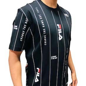 Camiseta masculina confeccionada em malha de poliéster com textura quadriculada. A modelagem raglan com manga curta proporciona maior liberdade de movimentos. As laterais deslocadas para frente e as costuras sem atrito com o corpo garantem maior conforto durante o uso. Possui gola careca, cobregola pespontado, e maxi estampa Fila Letter Outline em alto relevo centralizada na parte frontal.