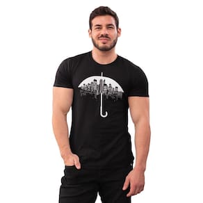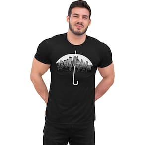 Estampa de um guarda-chuva em forma de prédios adornam o design. Camiseta com um toque urbano e cheio de estilo. Vista-se e mantenha-se preparado para enfrentar qualquer clima com elegância.