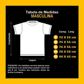 CAMISETA MASCULINA P: LARGURA 49CM E COMPRIMENTO 64CM M: LARGURA 53CM E COMPRIMENTO 67CM G: LARGURA 55CM E COMPRIMENTO 69CM GG: LARGURA 57CM E COMPRIMENTO 74CM EXG: LARGURA 59CM E COMPRIMENTO 79CM