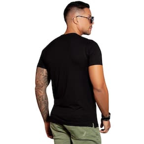 A camiseta com modelagem clássica e gola O proporciona caimento tradicional para o guarda-roupa masculino.