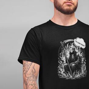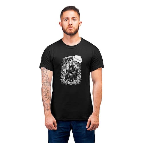 Com um toque de humor negro e um design arrojado, esta camiseta é perfeita para aqueles que apreciam o lado cômico da vida.