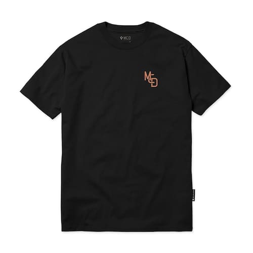 Camiseta MCD em malha penteada 30/1, estampa frontal, modelagem regular e etiquetas personalizadas.