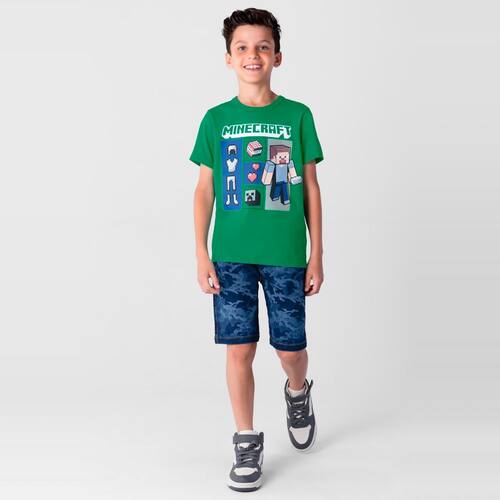 Camiseta infantil menino confeccionada em malha, perfeita para os pequenos fãs demonstrarem seu amor pelo universo Minecraft. A peça conta com estampa frontal Minecraft, decote redondo e mangas curtas. Invista!
