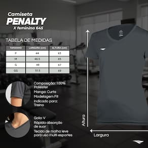 - Camiseta Penalty X Feminina Preta - Composição: 100% Poliéster - Cor predominante: Preto - Indicado para: Treino - Gênero: Feminino - Origem: Nacional - Logo Penalty aplicada no peito - Manga: Curta - Gola: V - Tecido de malha leve para uso multi esportes - Rápida absorção de suor - Modelagem Fit