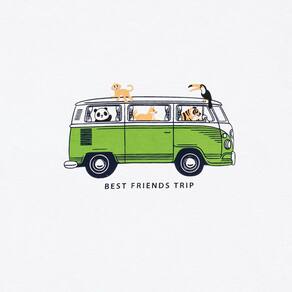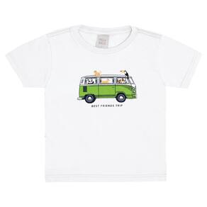 Para brincar com os amiguinhos durante os dias quentes nada como um lookinho super leve e fresquinho para acompanhar a energia dos pequenos. Camiseta em meia malha na cor branca com estampa de kombi com escrita "Viagem de melhores amigos. Aventura até o fim".