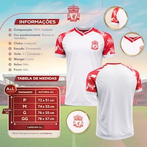 Características: - Composição: 100% Poliéster - Clube: Liverpool - Cor predominante: Branco e Vermelho - Escudo: Estampado - Gola: V ( Canelada ) - Manga: Curta - Bolso: Não - Forro: Não