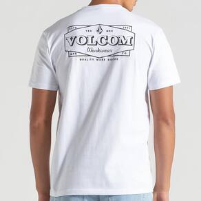 Camiseta Volcom feita em modelagem regular, meia malha 30.1, silk frente e costas, assinatura Volcom na manga, etiqueta interna e viés contrastante.