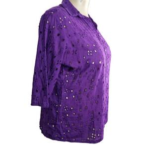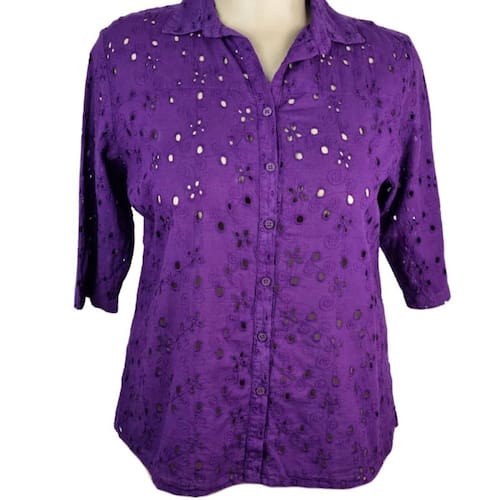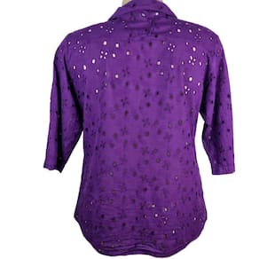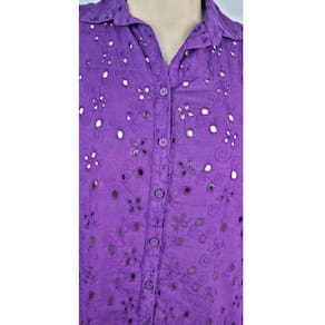 O tecido laise traz detalhes vazados que adicionam feminilidade e sofisticação à peça, enquanto a cor roxa confere personalidade e elegância.