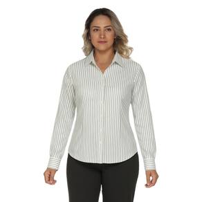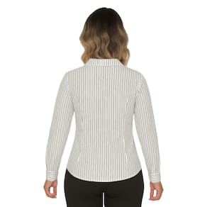 A estampa branca com listras finas em verde oliva traz um toque de estilo discreto e refinado.