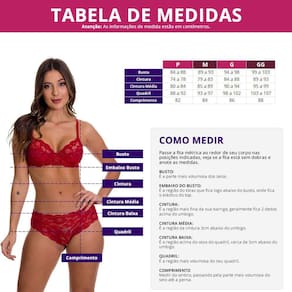 Tamanho P: Busto 84 a 88cm / Cintura 74 a 78cm / Cintura Média 80 a 84cm / Quadril 88 a 92cm / Comprimento 82