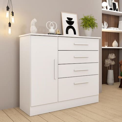 Com a Cômoda 4 Gavetas 1 Porta Chicago Tcil, seu quarto ficará completo e seus pertences bem organizados. Produzida inteiramente em MDP, esta cômoda possui 4 gavetas com corrediças telescópicas, uma porta com espaço para sapateira e um tampo de 25mm. Seu acabamento é resistente, com impressão UV e verniz de alta durabilidade.