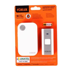 A bateria vem envolta em uma película de plástico transparente. É necessário retirar essa película antes de colocar a bateria na campainha. A película tem uma marcação traçada por onde deve ser feita a remoção. A Campainha Digital sem Fio Foxlux possui codificação exclusiva que impede o acionamento por outros controles.
