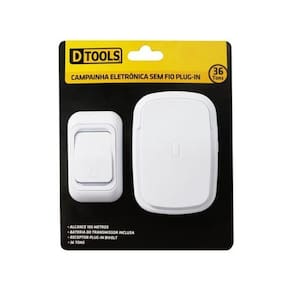 Campainha Sem Fio Plug In - Dtools A campainha possui 36 tons com alcance de ate 100 metros e um receptor Plug In Bivolt. Bateria do transmissor inclusa. Especificações Alcance 100m Cor Branco Código 19818 Altura 30.1 cm Largura 3.1 cm Comprimento 30.1 cm Peso Bruto 0.143 kg