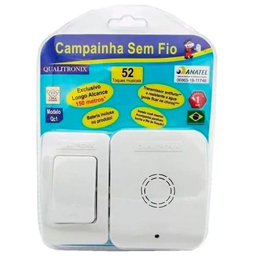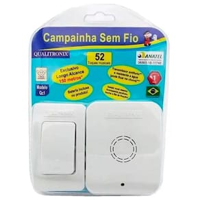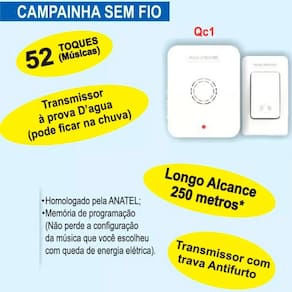 Para utilização em residências, lojas, salas comerciais, industrias, recepções e etc Corpo em plástico ABS. Instalação não requer fios. Alcance de 100 m em áreas livres. Homologado pela ANATEL. Ean: 7898246050957
