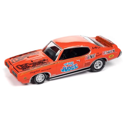 Novo modelo de carro fundido sob pressão em escala 1/64 de Pontiac GTO Orange 1969 com gráficos “The Judge - Arnie 'The Farmer' Beswick” “Racing Champions Mint 2023" Versão 1 Edição limitada a 2500 peças Modelo de carro fundido sob pressão mundial da Racing Champions RC016-RCSP029A