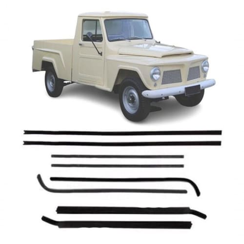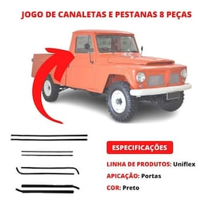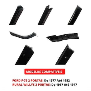 Canaletas Da Porta Rural Willys Pick-up F75 Todos CONTEÚDO DA EMBALAGEM ------------------------------------------------- - Jogo De Canaletas Das Portas - C/ Pestana - 8 Pçs. APLICAÇÃO NOS SEGUINTES VEÍCULOS: ----------------------------------------------------------- FORD Rural Willys - Pick-up - F75
