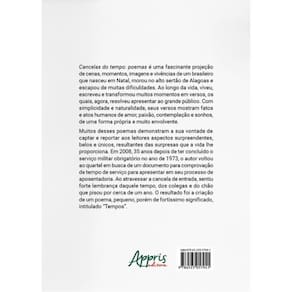 Cancelas do tempo: poemas é uma fascinante projeção de cenas, momentos, imagens e vivências de um brasileiro que nasceu em Natal, morou no alto sertão de Alagoas e escapou de muitas dificuldades. Ao longo da vida, viveu, escreveu e transformou muitos momentos em versos, os quais, agora, resolveu apresentar ao grande público. Com simplicidade e naturalidade, seus versos mostram fatos e atos humanos de amor, paixão, contemplação e sonhos, de uma forma própria e muito envolvente. Muitos desses poemas demonstram a sua vontade de captar e reportar aos leitores aspectos surpreendentes, belos e únicos, resultantes das surpresas que a vida lhe proporciona. Em 2008, 35 anos depois de ter concluído o serviço militar obrigatório no ano de 1973, o autor voltou ao quartel em busca de um documento para comprovação de tempo de serviço para apresentar em seu processo de aposentadoria. Ao atravessar a cance-la de entrada, sentiu forte lembrança daquele tempo, dos colegas e do chão que pisou por cerca de um ano. O resultado foi a criação de um poema, pequeno, porém de fortíssimo significado, intitulado “Tempos”. Marca: ARTERA EDITORA