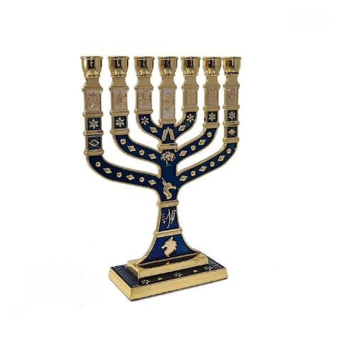 Menorá de latão, excelente acabamento Pintada de cores diversas Tamanho 18 cm de altura Tema: 12 tribos de israel: