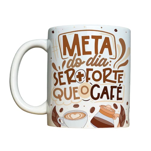 Caneca 325ml Vibes Meta do dia: ser + forte que o caféIdeal para você ou presentear!Serve para ornamento decorativo, vaso, porta lápis, porta treco, caneca, etcCapacidade: 325mlTamanho: Altura: 9,5cm – Largura (Alça): 12cm – Diâmetro: 8cmMaterial: CerâmicaProduto novo com caixaVALOR UNITÁRIOLavar antes do usoNão usar lava-louçasNão usar a parte verde da esponjaPode ir no micro-ondas, mas evite o excesso e uso prolongadoLavar com esponja maciaQuedas ou choques podem danificar o produtoNão utilizar limpa alumínio e saponáceos Marca: LARANJA E MIMOS
