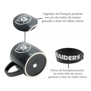 O logotipo dos Raiders está presente em baixo relevo na caneca, o que confere um realismo impressionante à peça. Feito com corte a laser, o logotipo apresenta detalhes precisos e de alta qualidade. Além disso, a caneca tem um design elegante, toda na cor preta, com o logotipo em fundo branco e parte interna na cor branca.