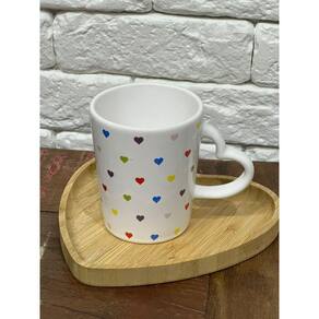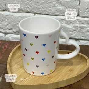 Caneca cerâmica 270ml branca alça e estampa coração colorido Caneca feita em cerâmica e tem capacidade de 270ml, seu detalhe fica por conta da alça em formato de coração e é toda estampada com corações. Ideal para presentear alguém especial com seu design fofo e romântico ou para um café, chá, chocolate quente ou qualquer bebida que preferir.