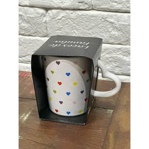 Características do produto Material: cerâmica Capacidade: 270ml Cor: branca com corações coloridos Dimensões axlxp : 10 x 11 x 8 cm
