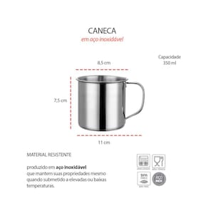 Caneca em aço inoxidavel. As canecas sao perfeitas para acampar ou super pratica para uso em restaurante, buffets, bares e lanchonetes. Pode ser usada na lava louças e tem muito mais durabilidade que as canecas produzidas em outros materiais.