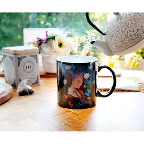 - UMA COMBINAÇÃO MÁGICA: represente seu amor pela Casa Gryffindor com esta xícara de café, com Harry de um lado e Hermione do outro. Borboletas e flores cercam as fotos da bruxa e do mago, que foram reimaginadas no estilo anime.
