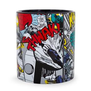 - Design poderoso: esta caneca de café preta é uma explosão de energia cinética colorida adequada para um super-herói. O design repleto de ação apresenta vários personagens da Marvel em um painel clássico de quadrinhos.