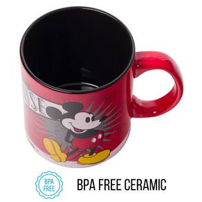 - Mouse Mickey vintage: a caneca vintage apresenta o adorável Mickey Mouse em seu esboço clássico de 1928 em um fundo vermelho.