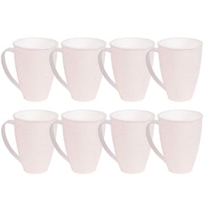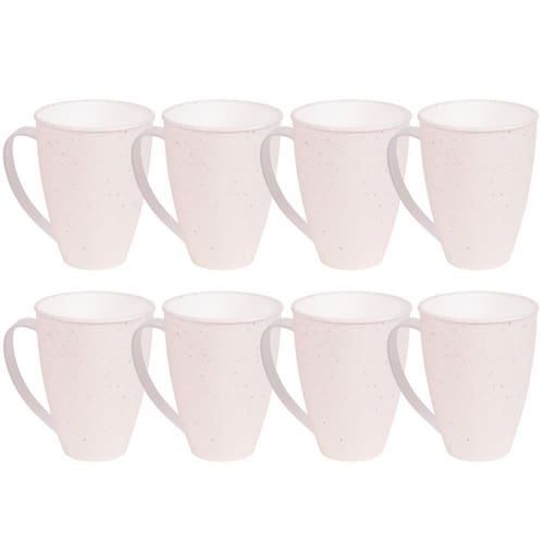 Conjunto com 8 unidades. Caneca de plástico alça para servir água, suco, refrigerante, chá, café, com decoração predominantemente branca com leves traços/ranhuras pretas por toda a peça, que traz uma aparência marmorizada super requintada ao produto.