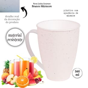 Este produto da nova linha marmorizada traz um toque peculiar, estiloso e moderno aos seus utensílios de servir. A caneca tem capacidade para 360ml. O produto é fabricado em polipropileno atóxico de alta densidade, totalmente seguro para a alimentação e livre de BPA em sua composição. A decoração no fundo do produto é permanente devido à tecnologia aplicada em sua fabricação, que não permite desbotamento e mantém os detalhes marmorizados vivos por mais tempo. A caneca, inclusive, pode ser levada com segurança tanto ao freezer como microondas, sem comprometimento da integridade do material e tampouco da saúde de quem nele se serve. O produto suporta temperaturas extremas variantes entre -10º e 120º, embora não possa ser levado ao forno convencional.