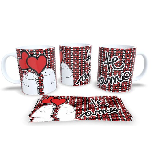 Caneca personalizada de porcelana de alto brilho, com interior e Alça Branca Coleção Flork Namorados.