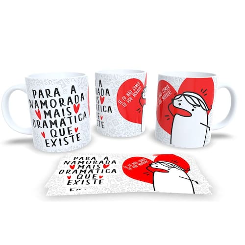 Caneca personalizada de porcelana de alto brilho, com interior e Alça Branca Coleção Flork Namorados.