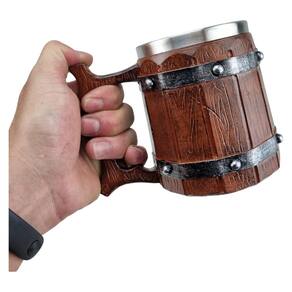 Aprecie sua bebida favorita com estilo viking utilizando a Caneca De Resina e Aço Estilo Barril Viking 400ML Medieval. Feita para os amantes da cultura medieval, essa caneca combina o charme rústico de um barril com a durabilidade moderna do aço inox.