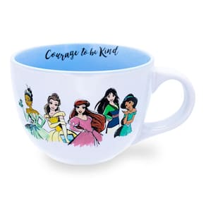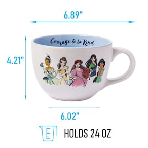 - Caneca superdimensionada: nossa caneca de sopa grande comporta 680 g de sua bebida favorita e apresenta uma foto de grupo das princesas Aurora, Merida, Cinderela, Moana, Tiana, Bela, Ariel, Mulan e Jasmine posando