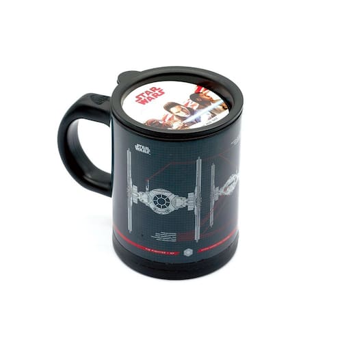 Misture sua bebida com esta incrível caneca de viagem de Star Wars Tie Fighter! Aperte o botão e veja como a caneca se mistura e mexe sua bebida! Ideal para café, chá, chocolate quente ou qualquer outra bebida na galáxia. Este produto oficialmente licenciado é perfeito para qualquer fã de Star Wars! 340 g. Instruções de cuidados: lavar apenas à mão. Não usar no micro-ondas. Oficialmente licenciado. Requer 2 pilhas AAA (não incluídas).