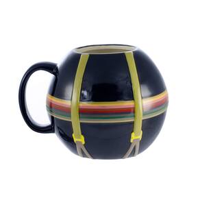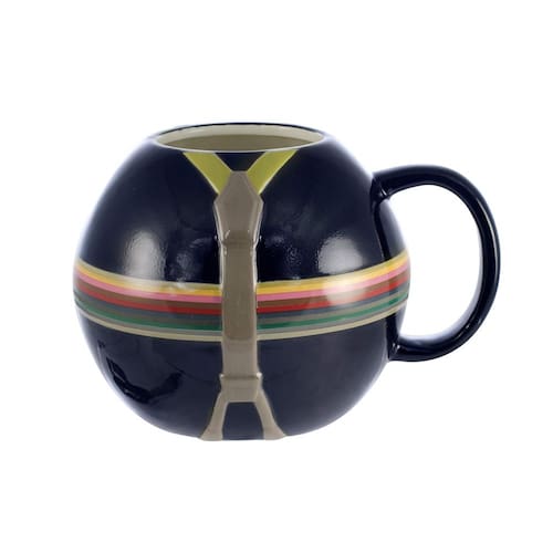 - Design divertido: a caneca esférica mostra a roupa do 13º Doutor com uma camisa listrada de arco-íris e suspensórios.