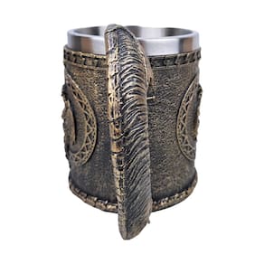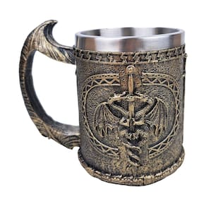 Caneca Espada 2 Dragões de Resina Essa caneca irada vai deixar suas manhãs mais épicas Com um design de dois dragões feito de resina, essa caneca cinza com detalhes dourados é perfeita para quem gosta de um toque de fantasia no dia a dia. Ideal para aquele cafezinho ou chá, vai dar um toque único à sua rotina. Não é indicado para micro-ondas nem lava-louças, então é melhor cuidar dela com carinho. Marca Tenda Medieval.