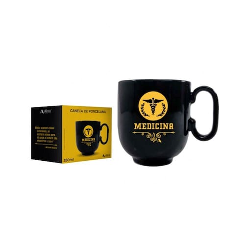Caneca Forma Preta Medicina 350ml Presente ideal para amantes de Medicina, Produzido em caneca de porcelana,cor preta e estampado com a cor amarela, contem símbolo da Medicina e dizeres "Não existem coisas incuráveis, só existem coisas para as quais o homem não encontrou a cura- Bernard Baruch" Ideal para o ambiente de trabalho, em reuniões ou até mesmo no momento de descanso e café da manhã. Dica de uso e preservação: 1 - Lavar com esponja macia e detergente neutro, seguido de pano limpo e seco.2 - Não utilizar produtos químicos ou abrasivos3 - Produto de vidro, manuseie com cuidado.4 - Choque e impactos podem provocar rachaduras ou quebras.