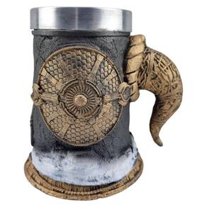O copo interno em inox reforça a resistência e facilita a limpeza, combinando praticidade e durabilidade. Esta caneca colecionável é uma peça essencial para quem valoriza qualidade e adora o universo de mitologias e batalhas épicas.