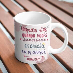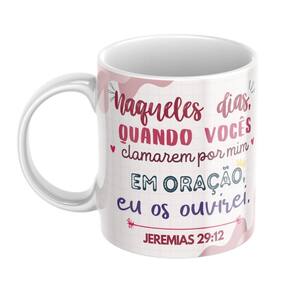 Caneca Personalizada Jeremias 29:12 - Porcelana 325 ml Naqueles dias Quando vocês clamarem por mim em oração eu os ouvirei jeremias 29:12 Uma lembrança diária da força da oração. Esta caneca foi criada para inspirar momentos de conversa com Deus e fortalecer sua fé a cada gole. Ideal para começar o dia em paz, renovar a esperança ou presentear alguém especial com uma mensagem poderosa da Palavra. Feita em porcelana branca de alta qualidade, sua estampa é aplicada por sublimação direta - com cores vivas, durabilidade e acabamento impecável sem adesivo . Destaques: Estampa dos dois lados com o versículo Jeremias 29:12 Pode ir ao micro-ondas e lava-louças Ideal para bebidas quentes ou frias Qualidade premium AAA+ Especificações: Altura: 9,5 cm Diâmetro: 8 cm Capacidade: 325 ml Material: Porcelana branca Transforme sua rotina com uma caneca que carrega mais do que café: carrega fé, oração e a certeza de que Deus ouve. Marca: Não Informado