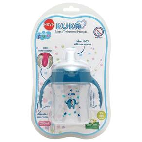 Caneca Kuka Treinamento Azul 200Ml 6+ Bico 100% Silicone Caneca Treinamento Decorada desenvolvida para auxiliar a criança que está começando a se alimentar sozinha, ideal para fase de transição. Alças com texturas que combinam com o desenho divertido sobreposto estimulando a imaginação da criança. O bico 100 % silicone macio com toque suave, é antivazamento e proporciona a saída de líquidos através da sucção da criança. Com capuz protetor. Modo de usar Antes do primeiro e após cada uso, separe os componentes (tampa, caneca e bico), lave com água, detergente neutro e enxágue bem. Cor: Azul Recomendações Antes de cada uso lave com água, detergente e enxágue bem. Caso a caneca fique virada com o bico para baixo, algumas gotas poderão sair pelos orifícios. Não permita que a criança corra com a caneca, evitando acidentes. Verifique regularmente o estado da caneca e tampa. Caso haja sinal de desgaste, descarte-a imediatamente. Não utilizar a caneca sem supervisão constante de um adulto. Nunca utilize a caneca com líquidos carbonados (refrigerantes e outros) ou sucos que contenham polpa. Este caneca pode ser usada para aquecimento de líquidos no forno micro-ondas, sem a tampa e pode ser lavado em lava-louças. Substituir a caneca após 1 a 2 meses de uso por motivos de higiene e segurança. Não utilize materiais abrasivos ou solventes de limpeza, pois os mesmos podem riscar a caneca e dissolver os desenhos. Utilize somente detergente neutro para lavar a caneca; Não permita que a criança mastigue ou morda o material macio do bico de silicone, evitando assim que a criança se engasgue e danifique o bico; Não limpar o bico com objetos pontiagudos e cortantes pois poderá danificar o produto. Lave em água morna usando sabão neutro e enxágue bem; A caneca poderá absorver os pigmentos de alguns alimentos devido a característica do material. Isto não compromete a utilização do produto. Após cada uso, a caneca deve ser lavada conforme instruções na embalagem. Bico de silicone macio antivazamento. Capuz protetor.