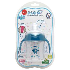 Caneca Kuka Treinamento Azul 200Ml 6+ Bico 100% Silicone Caneca Treinamento Decorada desenvolvida para auxiliar a criança que está começando a se alimentar sozinha, ideal para fase de transição. Alças com texturas que combinam com o desenho divertido sobreposto estimulando a imaginação da criança. O bico 100 % silicone macio com toque suave, é antivazamento e proporciona a saída de líquidos através da sucção da criança. Com capuz protetor. Modo de usar Antes do primeiro e após cada uso, separe os componentes tampa, caneca e bico , lave com água, detergente neutro e enxágue bem. Cor: Azul Recomendações Antes de cada uso lave com água, detergente e enxágue bem. Caso a caneca fique virada com o bico para baixo, algumas gotas poderão sair pelos orifícios. Não permita que a criança corra com a caneca, evitando acidentes. Verifique regularmente o estado da caneca e tampa. Caso haja sinal de desgaste, descarte-a imediatamente. Não utilizar a caneca sem supervisão constante de um adulto. Nunca utilize a caneca com líquidos carbonados refrigerantes e outros ou sucos que contenham polpa. Este caneca pode ser Utilizado para aquecimento de líquidos no forno micro-ondas, sem a tampa e pode ser lavado em lava-louças. Substituir a caneca após 1 a 2 meses de uso por motivos de higiene e segurança. Não utilize materiais abrasivos ou solventes de limpeza, pois os mesmos podem riscar a caneca e dissolver os desenhos. Utilize somente detergente neutro para lavar a caneca; Não permita que a criança mastigue ou morda o material macio do bico de silicone, evitando assim que a criança se engasgue e danifique o bico; Não limpar o bico com objetos pontiagudos e cortantes pois poderá danificar o produto. Lave em água morna usando sabão neutro e enxágue bem; A caneca poderá absorver os pigmentos de alguns alimentos devido a característica do material. Isto não compromete a utilização do produto. Após cada uso, a caneca deve ser lavada conforme instruções na embalagem. Bico de silicone macio antivazamento. Capuz protetor. Ean: 7896000661814