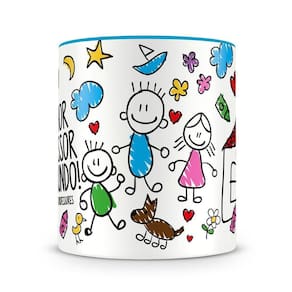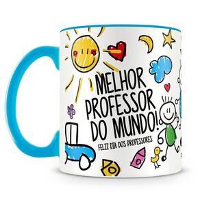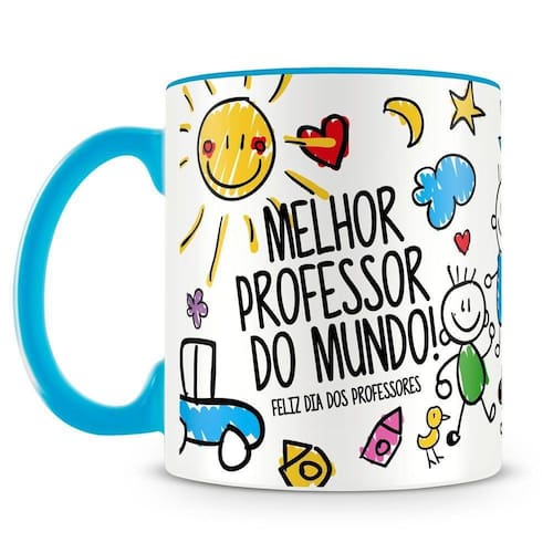 Caneca personalizada de porcelana de alto brilho, interior e alça azul claro, com divertida estampa para professor.