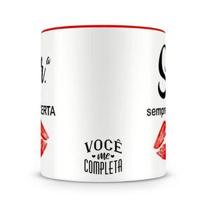 Caneca personalizada de porcelana de alto brilho interior e alça vermelha, com estampa Sra. Quase Sempre Certo.
