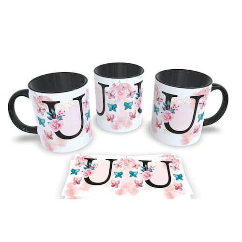 Caneca de porcelana de alto brilho, com alça e interior Preta Coleção Alfabeto Iniciais Nomes.