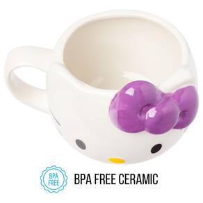 - SANRIO HELLO KITTY: Eleve seu café da manhã com esta caneca Hello Kitty cuidadosamente trabalhada. Esculpida para parecer a adorável Hello Kitty balançando seu arco clássico em roxo.