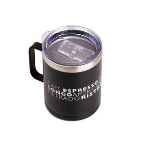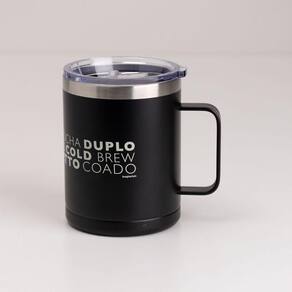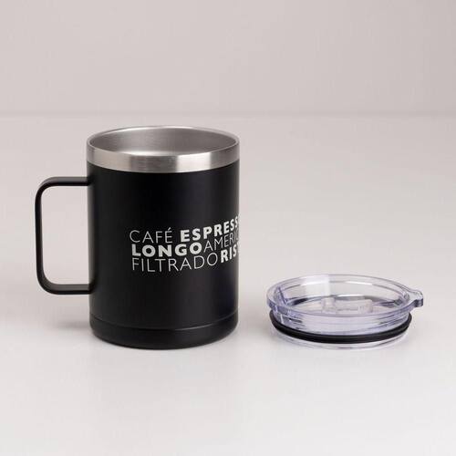 Toda em aço inoxidável e contando com 1 tampa com bocal, ela traz o nome de diversos tipos de cafés impressos na cor off-white e tem capacidade para 400 ml do seu café fresquinho. Sendo a caneca para escritório perfeita para levar pro trabalho e também uma ótima opção de presente, já que mantém a bebida fria por até 12 horas e quente por até 3 horas!